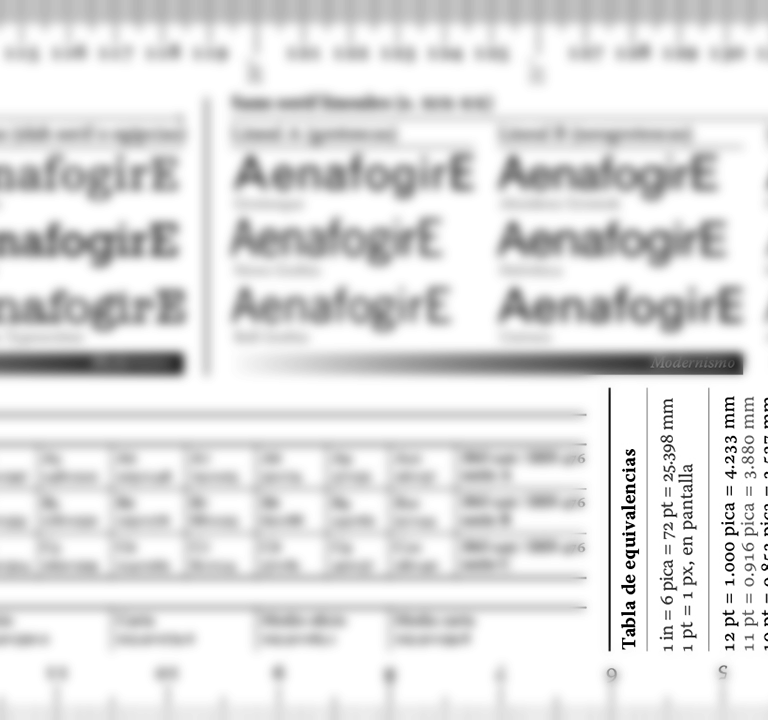 En sentido vertical, se describen las variantes de tamaño óptico, es decir, los diseños ex profeso para emplearse en ciertos tamaños de cuerpo, una práctica casi desconocida por los diseñadores nóveles debido a que las fuentes digitales pueden escalase casi sin restricción a cualquier tamaño. En la parte inferior, del lado izquierdo, se detalla la correspondencia entre el nombre del cuerpo óptico y el puntaje para el que fue diseñado (figura 7).